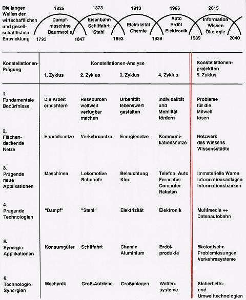 Entsprechende Überlegungen z. B. zu den Konstellationen der Kondratieff-Zyklen haben aber gezeigt, daß die wirtschaftlichen und gesellschaftlichen Entwicklungen in auf sprunghaften Basisinnovationen aufbauenden langen Wellen zu verlaufen scheinen (s. Darstellung 6).