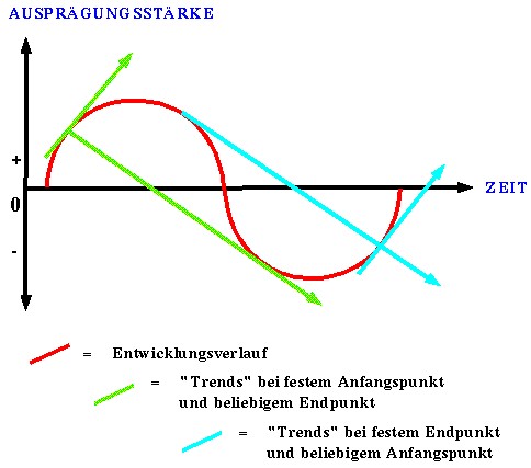 Die Problematik bei Trendbestimmungen ergibt sich in erster Linie aus der Wahl des Anfangs- und Endpunktes. Bei jedem nichtlinearen oder nicht linear ähnlichen Verlauf ist durch die Auswahl der Betrachtungsspanne ein fast beliebiger Verlauf des sog. "Trends" begründbar. (s. Darstellung 2).