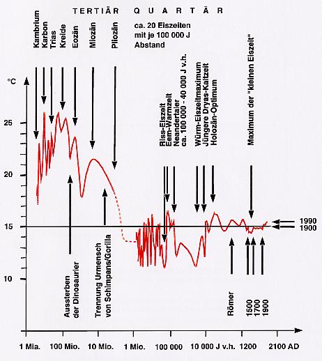 Selbst Vorgänge wie die Erdtemperaturveränderungen vor Auftreten des Menschen unterlagen seit Jahrmillionen ganz erheblichen Schwankungen (s. Darstellung 7).