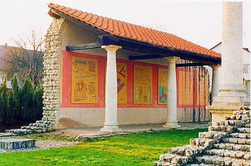 Tempel Faimingen (Sponsor: Institut für Wirtschaftsökologie) In Faimingen (Stadt Lauingen) befindet sich der teilweise rekonstruierte Tempel des keltoromanischen Heilgottes Apollo Grannus. Restaurierter Seitengang mit Erläuterungsbildern