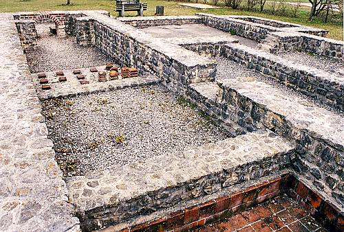 Großsorheim-Harburg (Sponsor: Institut für Wirtschaftsökologie) Am östlichen Ortseingang von Großsorheim wurde vor wenigen Jahren beim Bau eines Siedlungshauses eine römische Badeanlage freigelegt. Die Grundmauern wurden teilweise restauriert. (Text nach Dettweiler) Römisches Bad