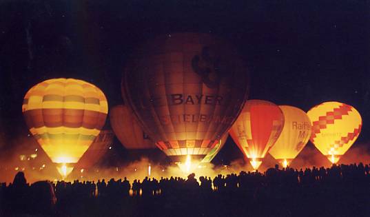 Bad Steben - Ballonglühen (Sponsor: Institut für Wirtschaftsökologie) Alljährlich findet in Bad Steben ein großes Heißluft-Ballonfest statt, dessen Höhepunkt das spätabendliche Ballonglühen ist. (Text: K. Marquardt)