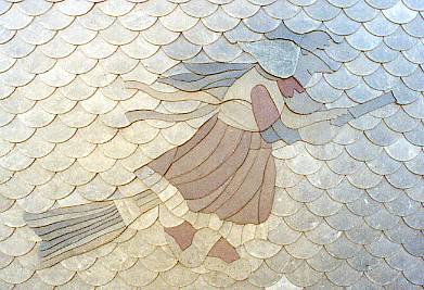 Rodesgrün - Schieferbild (Sponsor: Institut für Wirtschaftsökologie) Die leicht unterschiedlichen Färbungen des in der Region typischen Schiefers werden bei der Herstellung von Dach- und Wandabdeckungen oft zur Gestaltung überraschender Bildmotive genutzt, wie z. B. der Brockenhexe auf einer Hauswand in Rodesgrün. (Text: K. Marquardt).