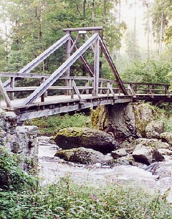 Teufelssteg im Selbitztal (Sponsor: Institut für Wirtschaftsökologie) Der Teufelssteg führt mitten im Höllental über die Selbitz, die sich bis zu 160 m tief in den harten Diabasfelsen eingeschnitten hat. (Text: K. Marquardt)