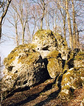 Finningen (Sponsor: Institut für Wirtschaftsökologie) Es heißt: Nur zu Ostern und nur dem, der reinen Gewissens ist, zeigt sich das Gesicht des Ostersteins (einem Riesauswurf). Tierknochen aus der Mittelsteinzeit (8000 - 5000 v. Chr.) und Scherben aus der Jungsteinzeit (5000 - 2000 v. Chr.) sowie 23 Grabhügel (Durchmesser 20-25 m, Höhe 1,5 m) belegen, dass sich hier eine uralte Kultstätte befand. Osterstein, Seitenansicht