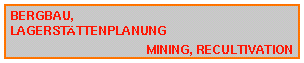 LAGERSTÄTTENAUSWAHL, RAHMENBETRIEBSPLÄNE, HAUPTBETRIEBSPLÄNE, ABBAU- UND REKULTIVIE- RUNGSPLÄNE, RÜCKSTELLUNGSSCHÄTZUNGEN, FOLGENUTZUNGSKONZEPTE (BERG- UND BAURECHT) Beispiele: Abbauintegration des Braunkohleabbaus in den Landkreisen Borna, Guben, Kassel; Integration von Kalkstein- Ton-, Lehm-, Kiesabbau im Landkreis Eisenberg; Rohstoff- sicherung für Ziegelwerke in Bayern, Thüringen, Sachsen, Hessen; Gesamplanungen für Kalkstein- und Kieswerke in Thüringen, Sachsen und Bayern (ca. 50 Projekte, von der Lagerstättenauswahl über die Raumordnung, Planfestellung bis hin zu Ausgleichplanungen bzw. der Planung von Folge- nutzungen), umwelt- und bergbaubezogene Broschüren Auszüge aus den Projekten: Abbaupläne (Abschlussbetriebsplan/Folgenutzung/Rekulti- vierung/Wasserhaltung) plans for surface mining Steinbruchsiedlung von Thüngen Beispiele für Bergbaufolgelandschaften: 1000 Hektar Paradiese Folgenutzung eines Bergsenkungsgebietes: Kunst- und Denk- park Ottweiler art- and thinkpark Ottweiler |